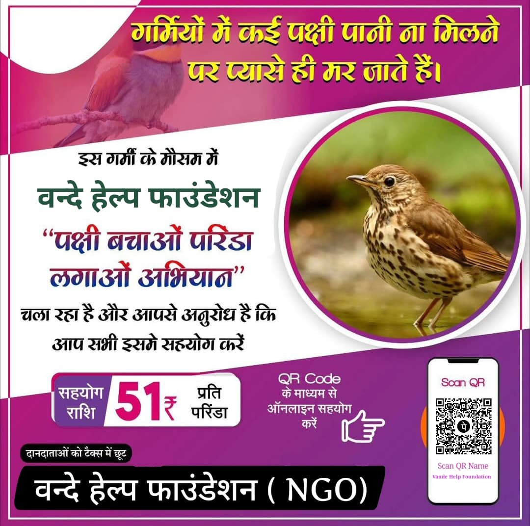 Donate to support Vande Help Foundation's "Save Birds, Put Parinda" campaign. We appeal to you to register your participation in the campaign by putting Parinda (small pots) for water and food in your home or nearby areas. So that the birds can get water and food in summer.