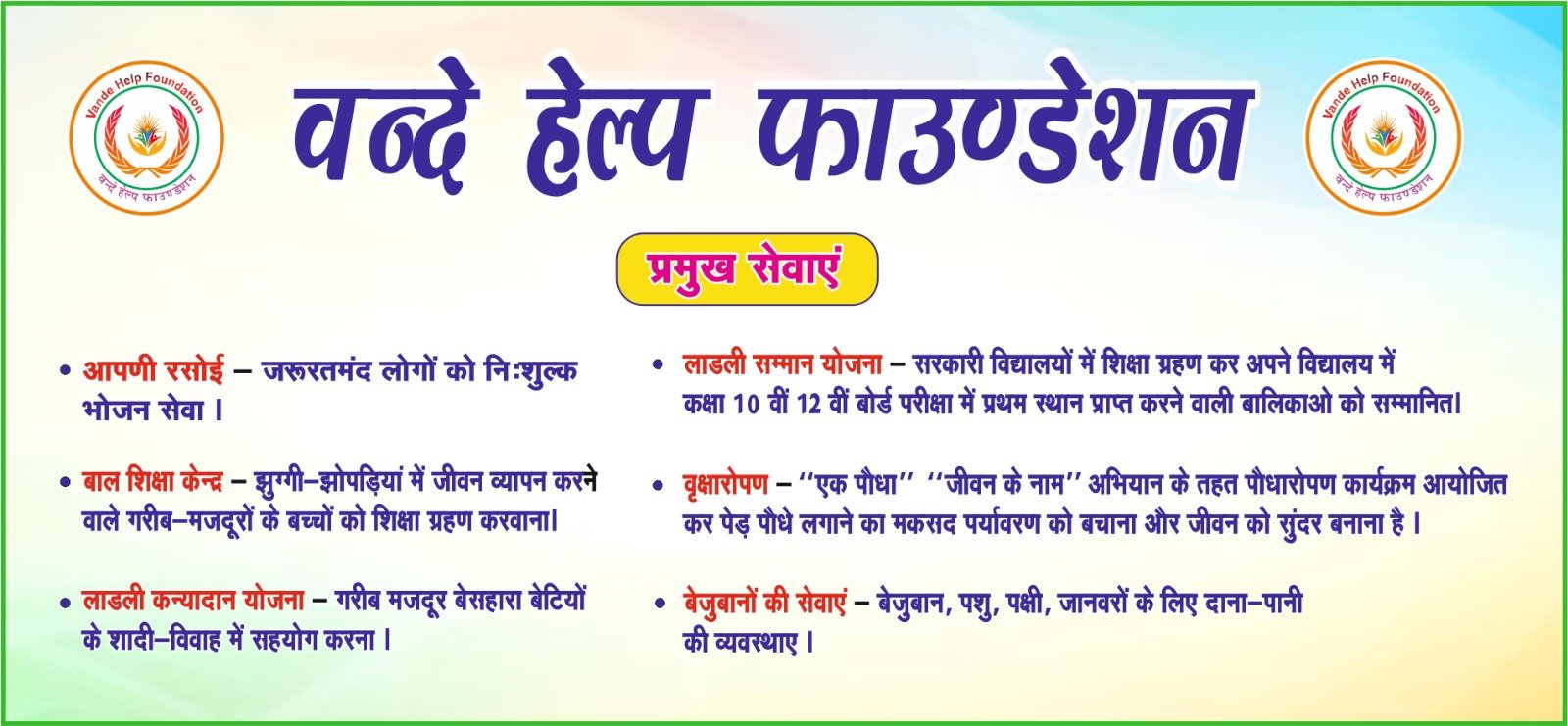 Vande Help Foundation Working Location - Delhi, Rajasthan, Haryana, Punjab, Jammu & Kashmir Working Category - 1. Heritage location prime temple 2. Highway Pinstop - National Highways & SH Expressways 3. Mall & Commercial Complex 4. High street plazas 5. Restaurants, Food Courts, City Hotels & Resorts 6. University, College, Hospital 7. Workplace, Residency side, Educational, Institutes